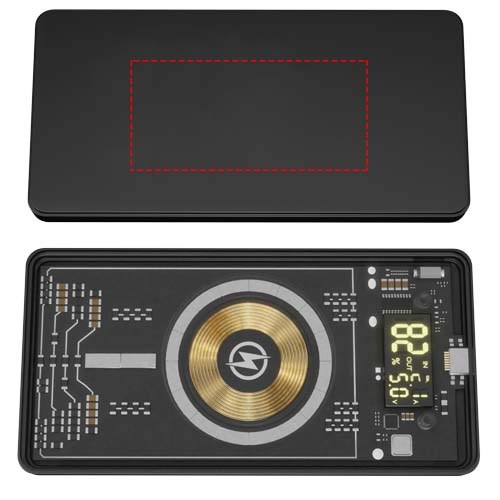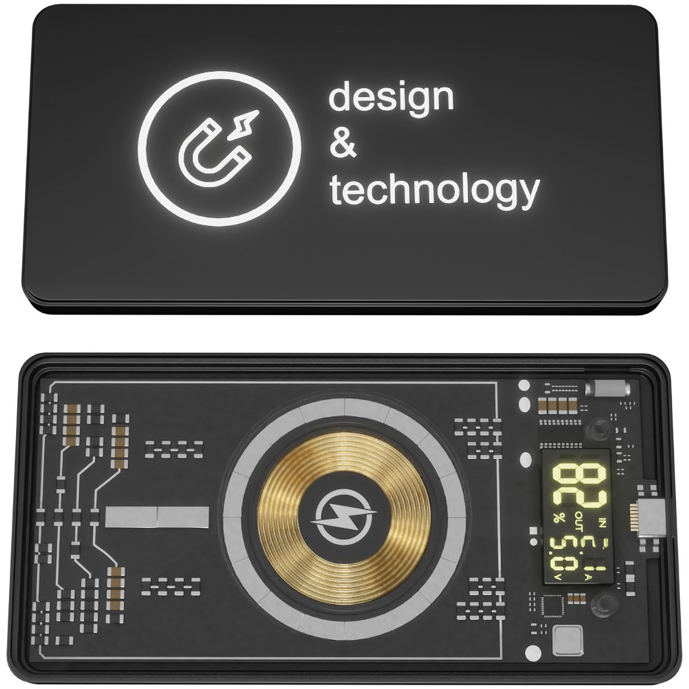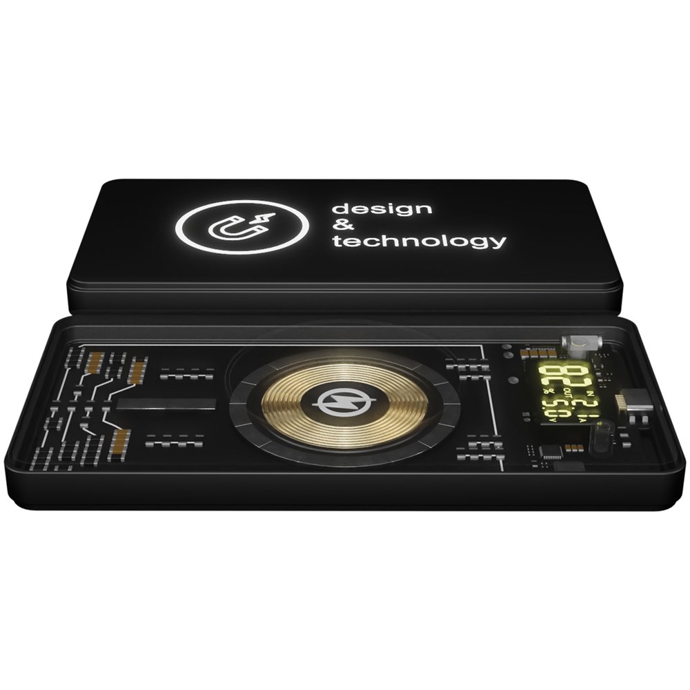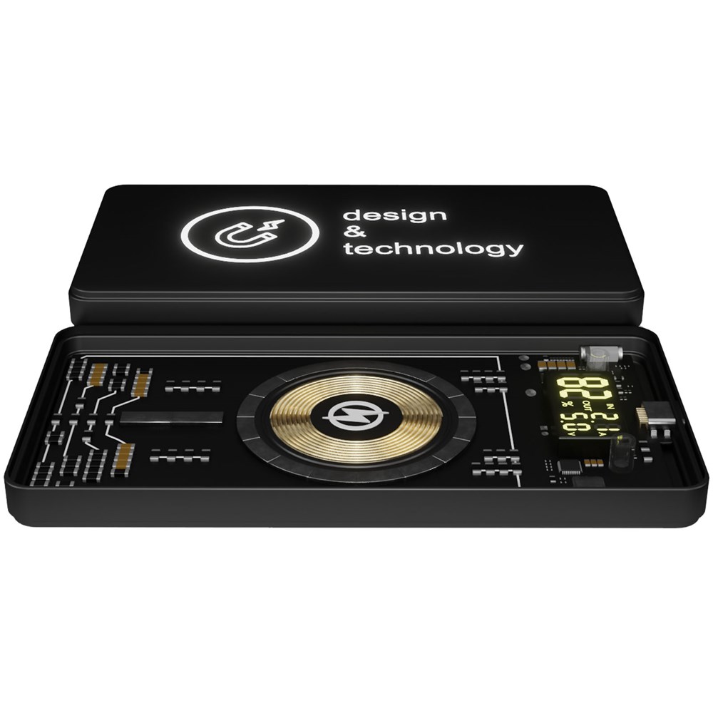 Magnetisch draadloos oplaadbare magnetische powerbank (14 x 7 x 1,3 cm) van 5000 mAh met 5 W draadloze oplaadfunctie, een digitaal display en USB-type-C-uitgang/-ingang. De technologie van deze powerbank wordt aan de achterkant onthuld dankzij de transparante behuizing die de printplaat laat zien. De voorkant heeft een rubberen zachte afwerking en met lasergravure licht het logo op. De powerbank heeft een dubbele USB 2 A-uitgang en is gemaakt van minimaal 50% gerecycled ABS plastic. Als de telefoon geen MagSafe-technologie heeft (vanaf iPhone 12), kan de magnetische sticker (meegeleverd) op de achterkant van de telefoon worden geplakt, zodat deze compatibel is met de magnetische houder. Geleverd met een 3-in-1 (type C, micro USB, iPhone) oplaadkabel van gerecycled PET. Verpakt in een geschenkverpakking (20,1 x 10 x 2 cm) met magnetische sluiting. Inclusief 3 jaar garantie.