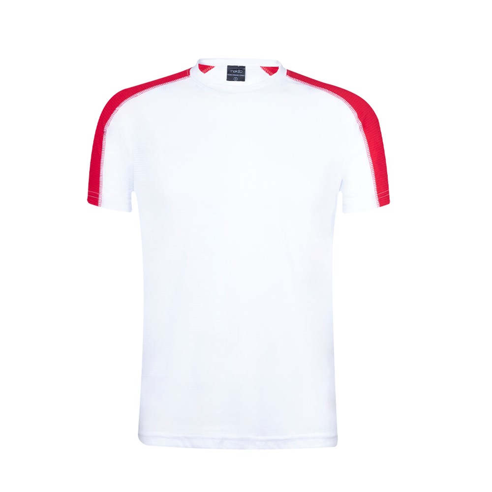 T-shirt voor volwassenen, dynamisch materiaal, goed ademend en bestaat uit 100% polyester 135g/m2. In een origineel wit design, met gekleurde strepen op de mouwen. Verkrijgbaar in verschillende kleuren en maten: S, M, L, XL, XXL.