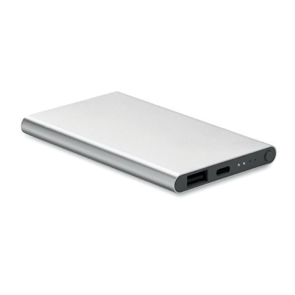 Powerbank met een capaciteit van 4000 mAh van gerecycled aluminium. Uitgangsstroom DC5V/2A. Inclusief indicatielampje en USB-kabel met Type C. In-/uitgang: Type-C.