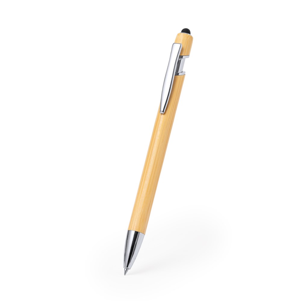 Balpenpen met drukknopmechanisme, bamboe loop, verchroomd beslag en zwarte wijzer. Metalen clip en blauwe inkt.