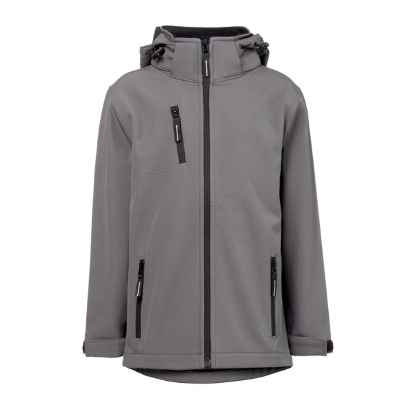 Kinderjas van 96% gerecycled polyester softshell en 4% elastaan (280 g/m²), met twee veters en waterafstotende voering. Met fleece gevoerde jas (100% gerecycled polyester) met 2 voorzakken en een diagonale borstzak, beide met rits. Afneembare en verstelbare capuchon met trekkoord en zelfklevende ritsband om de kraag aan te passen. Opening aan de voorkant met YKK® rits - een merk dat gebruik maakt van moderne apparatuur en hoge kwaliteitscontrole. Verstelbare manchetten met zelfklevende sluitband. Afgeronde onderrug. Maten: 4, 6, 8, 10, 12