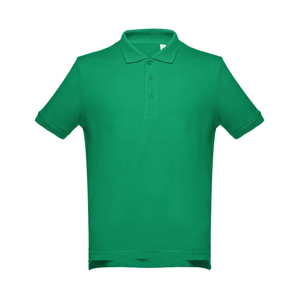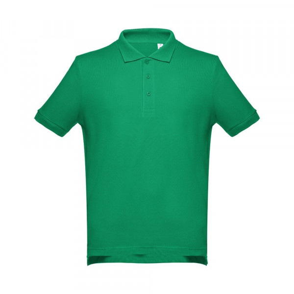 Poloshirt voor heren met korte mouwen van 100% gekaard piquékatoen katoen (195 g/m²) (kleur 183: 85% katoen/15% viscose). Deze polo heeft een normale pasvorm en heeft een kraag en geribde mouwen. De kraag is verstevigd met piqué tape. Aan de voorzijde naast de kraag zitten drie bijpassende kleurknopen (extra knoopje in de binnenzoom). Gesneden en genaaid stuk met kleine zijopeningen aan de onderkant van de polo. Maten: S, M, L, XL, XXL