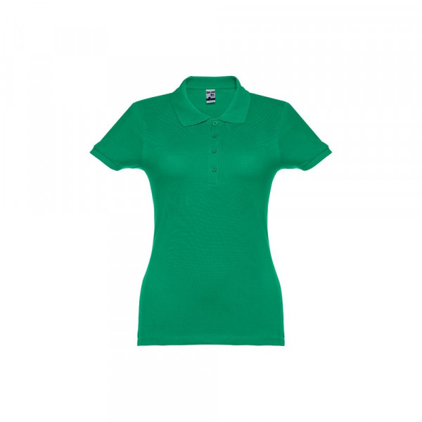 Damespolo met korte mouwen van 100% gekaard piqué katoen (195 g/m²) (kleur 183: 85% katoen/15% viscose). Bevat ribkraag en mouwen, de kraag is verstevigd met piquéband. Aan de voorzijde naast de kraag zitten vier bijpassende knopen (extra knoopje in de binnenzoom). Gesneden en genaaid stuk. Maten: S, M, L, XL, XXL