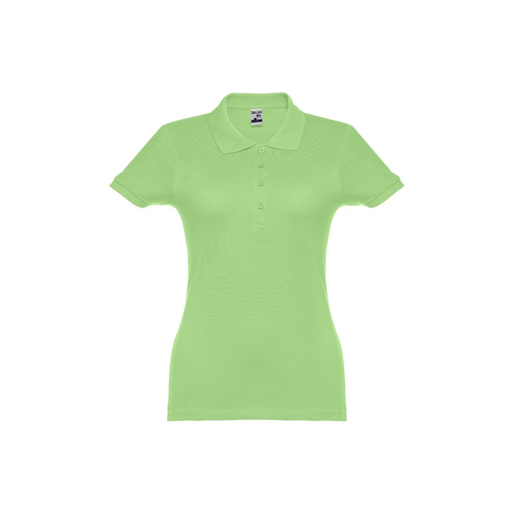 Damespolo met korte mouwen van 100% gekaard piqué katoen (195 g/m²) (kleur 183: 85% katoen/15% viscose). Bevat ribkraag en mouwen, de kraag is verstevigd met piquéband. Aan de voorzijde naast de kraag zitten vier bijpassende knopen (extra knoopje in de binnenzoom). Gesneden en genaaid stuk. Maten: S, M, L, XL, XXL