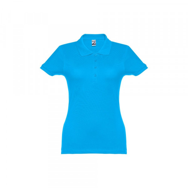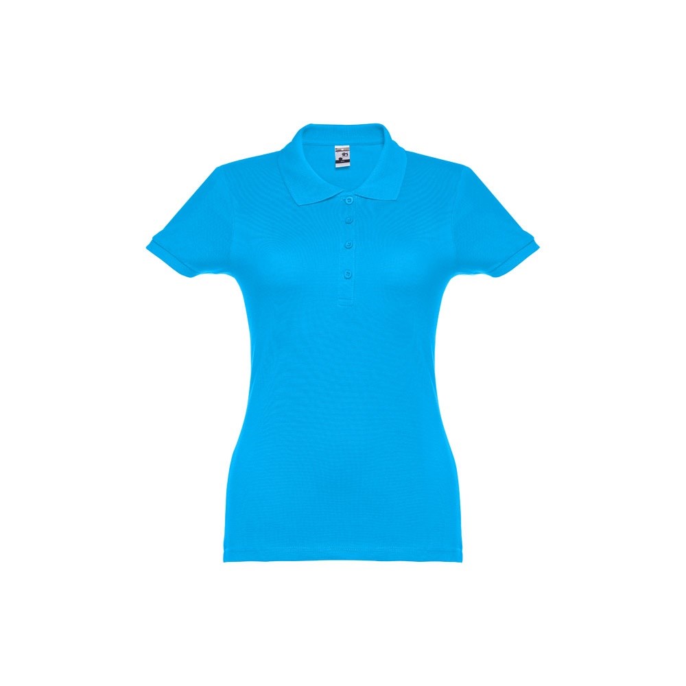 Damespolo met korte mouwen van 100% gekaard piqué katoen (195 g/m²) (kleur 183: 85% katoen/15% viscose). Bevat ribkraag en mouwen, de kraag is verstevigd met piquéband. Aan de voorzijde naast de kraag zitten vier bijpassende knopen (extra knoopje in de binnenzoom). Gesneden en genaaid stuk. Maten: S, M, L, XL, XXL
