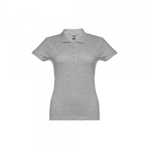 Damespolo met korte mouwen van 100% gekaard piqué katoen (195 g/m²) (kleur 183: 85% katoen/15% viscose). Bevat ribkraag en mouwen, de kraag is verstevigd met piquéband. Aan de voorzijde naast de kraag zitten vier bijpassende knopen (extra knoopje in de binnenzoom). Gesneden en genaaid stuk. Maten: S, M, L, XL, XXL