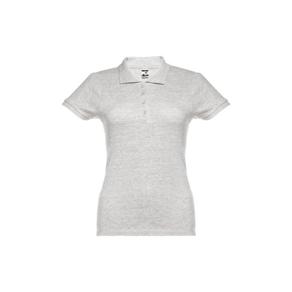 Damespolo met korte mouwen van 100% gekaard piqué katoen (195 g/m²) (kleur 183: 85% katoen/15% viscose). Bevat ribkraag en mouwen, de kraag is verstevigd met piquéband. Aan de voorzijde naast de kraag zitten vier bijpassende knopen (extra knoopje in de binnenzoom). Gesneden en genaaid stuk. Maten: S, M, L, XL, XXL
