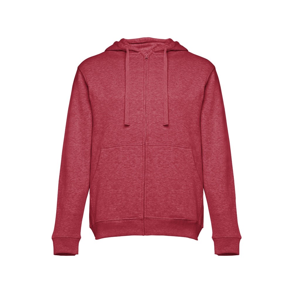 Heren sweatshirt van 50% katoen en 50% polyester (320 g/m²) met gekaarde binnenkant. De capuchon is gevoerd en bevat een gekleurde koordsluiting. Het voorste gedeelte heeft twee buidelzakken met een plastic sluiting.Stuk met manchetknopen en tailleband met elastiek. Maten: S, M, L, XL, XXL