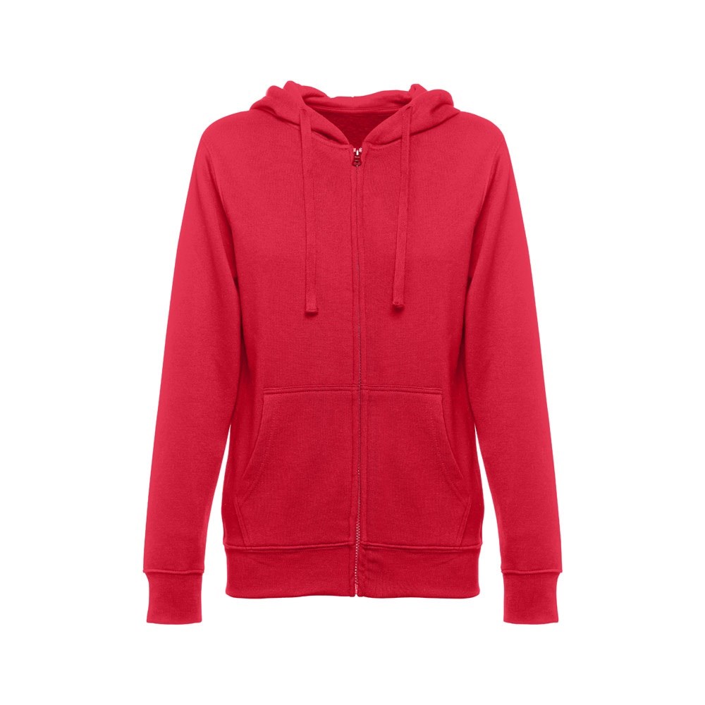 Dames sweatshirt van 50% katoen en 50% polyester (320 g/m²) met gekaarde binnenkant. De capuchon is gevoerd en bevat een gekleurde koordsluiting. Het voorste gedeelte heeft twee buidelzakken met een plastic sluiting. Stuk met manchetknopen en tailleband met elastiek. Maten: S, M, L, XL, XXL