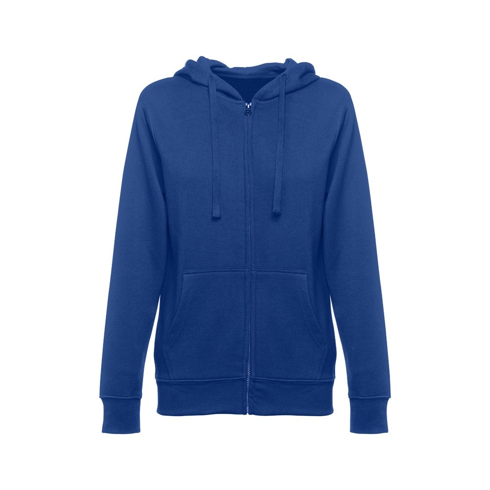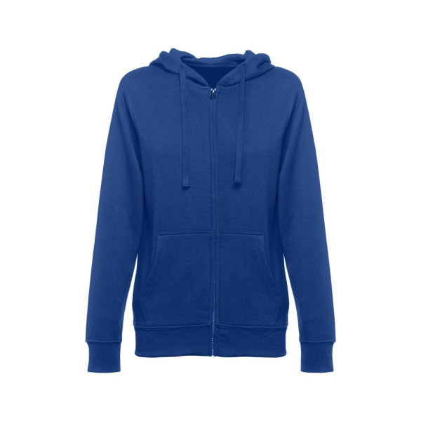 Dames sweatshirt van 50% katoen en 50% polyester (320 g/m²) met gekaarde binnenkant. De capuchon is gevoerd en bevat een gekleurde koordsluiting. Het voorste gedeelte heeft twee buidelzakken met een plastic sluiting. Stuk met manchetknopen en tailleband met elastiek. Maten: S, M, L, XL, XXL