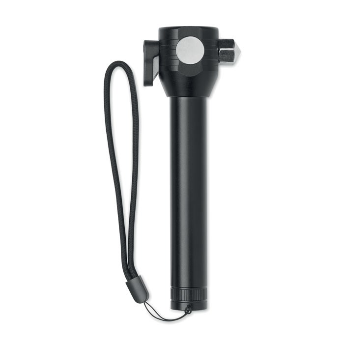 3 in 1 aluminium zaklamp met noodhamer en veiligheidsgordelsnijder. Hij heeft een COB-lamp aan de zijkant en voorkant. Inclusief magneet en polsband. Inclusief ingebouwde oplaadbare 500mAh batterij.