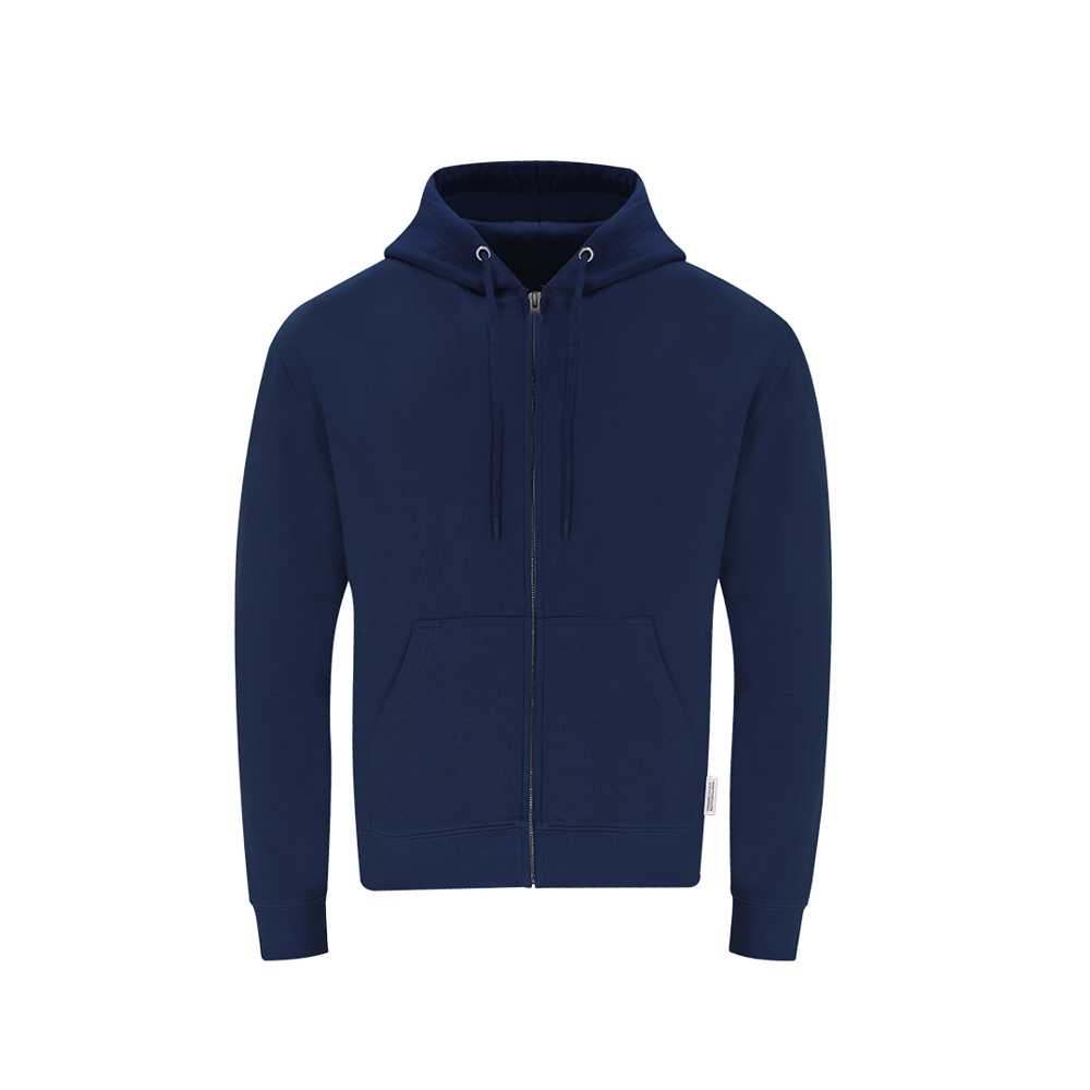 Unisex hoodie met rits van biologisch katoen en gerecycled polyester, in zacht fleece van 280 g/m². Met dubbele gevoerde capuchon, verstelbare ronde trekkoorden - met bijpassende stoppers - en metalen oogjes. Elastische ribgebreide manchetten en tailleband, en voorzak met kangoeroe-stijl. Verborgen metalen ritssluiting, met versterkte naadafdekking op de kraag. Inclusief opvallend ecologisch label.