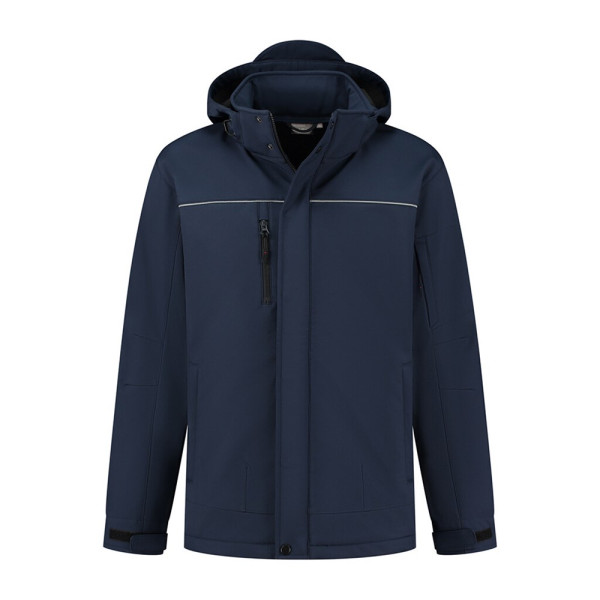 Softshell jacket, 94% polyester / 6% elastane, 3 laags softshell, ongewatteerd, stretch regular fit met opstaande kraag, mouw met klitteband, verstelbare manchetten en windvanger aan binnenzijde manchet, 2 steekzakken, borstzak en mouwzakje met YKK rits, winddicht, ademend, waterafstotend, binnenzak met rits en koptelefoonkabel doorgang, afneembare capuchon, reflectie piping op borst en rug, printersrits aan binnenzijde en onderzijde verstelbaar middels koord/stopper.
