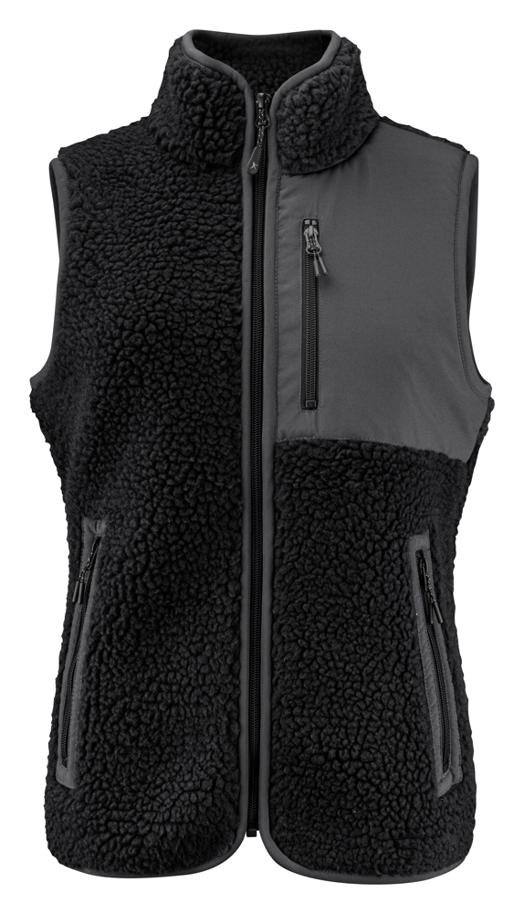 Bicolor teddy fleece bodywarmer. Contrasterende stof op de linkerborst en als afwerking van de naden. Borstzak en zijzakken met ritssluiting.