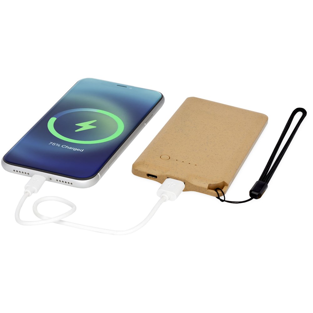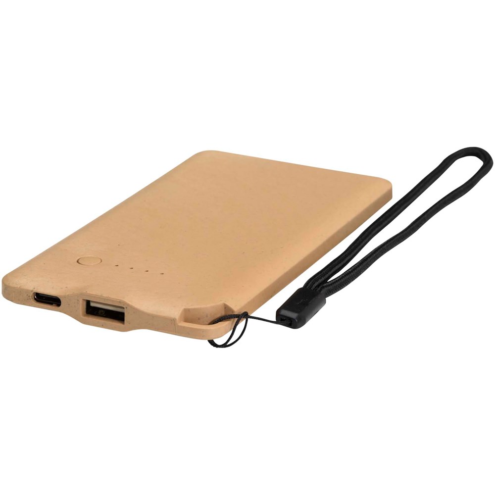 Biologisch afbreekbare en compacte powerbank met een handige lus voor eenvoudige bevestiging. Oplaadkabel inbegrepen. Ingang: DC 5 V/800mA. Uitgang: DC 5 V/1000mA. Batterij: Lithium-ion polymeer.
