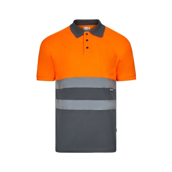 Tweekleurig bird-eye poloshirt (160g/m²) met korte mouwen, van polyester (100%). Contrasterende kleur knopen en kraag. Geribbelde kraag. Reflecterende strepen op de romp. Inclusief borstzakje. Product in overeenstemming met EU-verordening 2016/425, gecertificeerd door EN20471 en klasse Nº 1. Maat: 4XL, 5XL