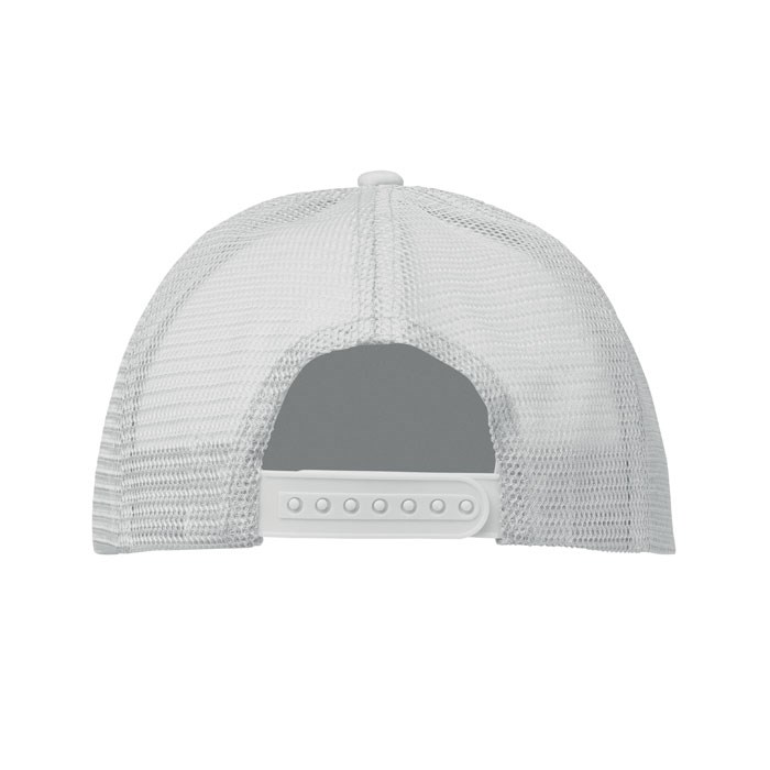 Truckers baseballpet van polyester 140-150 gr/m²met verstelbare sluiting. Witte voorzijde en gekleurde klep van polyester jersey met schuimrug. 5 Panelen. Andere panelen in gekleurde mesh. Size 7 1/4