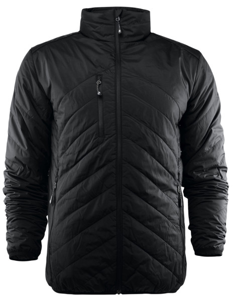 Gequilte, lichte jas met voering in contrasterende kleur. Verborgen capuchon in kraag met onzichtbare ritssluiting. Omgedraaide ritssluiting voorraan, aan de zijzakken en aan de borstzak. Verborgen ritssluiting aan de binnenzijde voor print- en of borduring. Elastische zoom onderaan