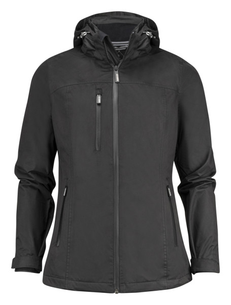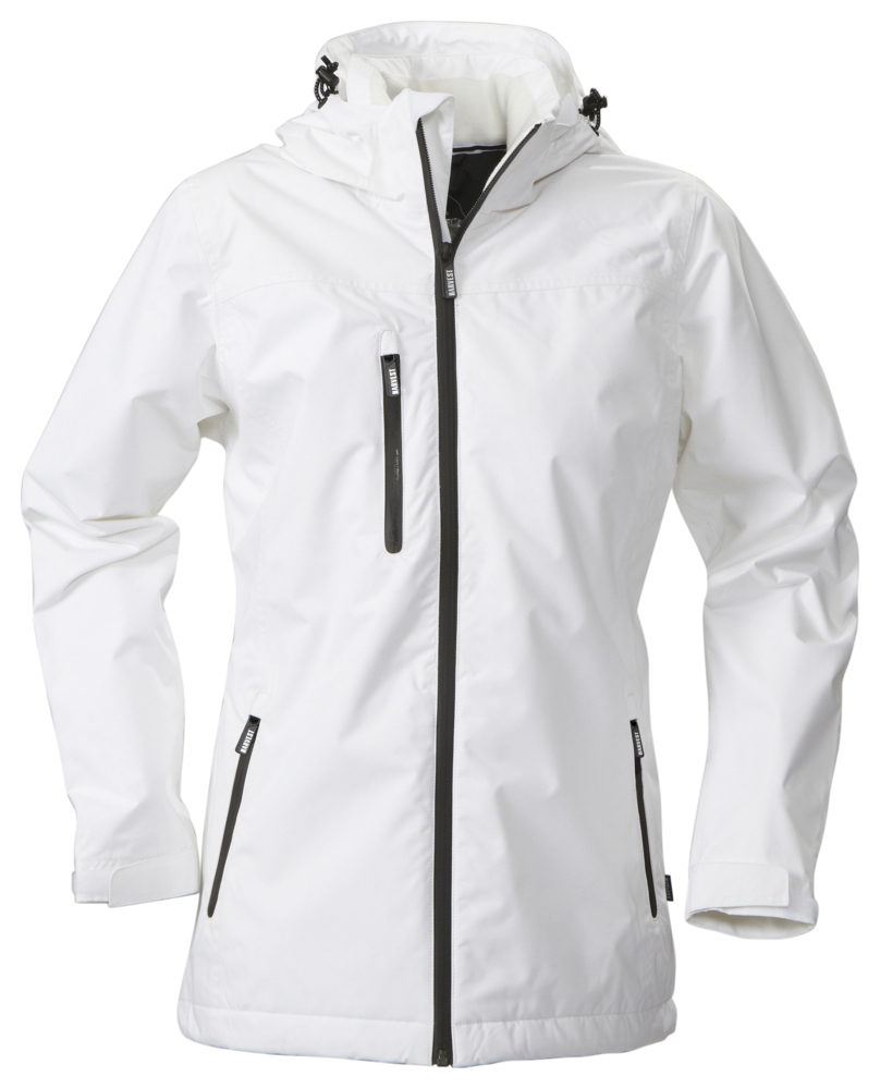 Functionele sportjas voor dames met getapete naden en waterdichte ritssluitingen. Verborgen ritssluiting op de rug en aan de capuchon voor het makkelijk aanbrengen van borduring en/of druk. Afneembare