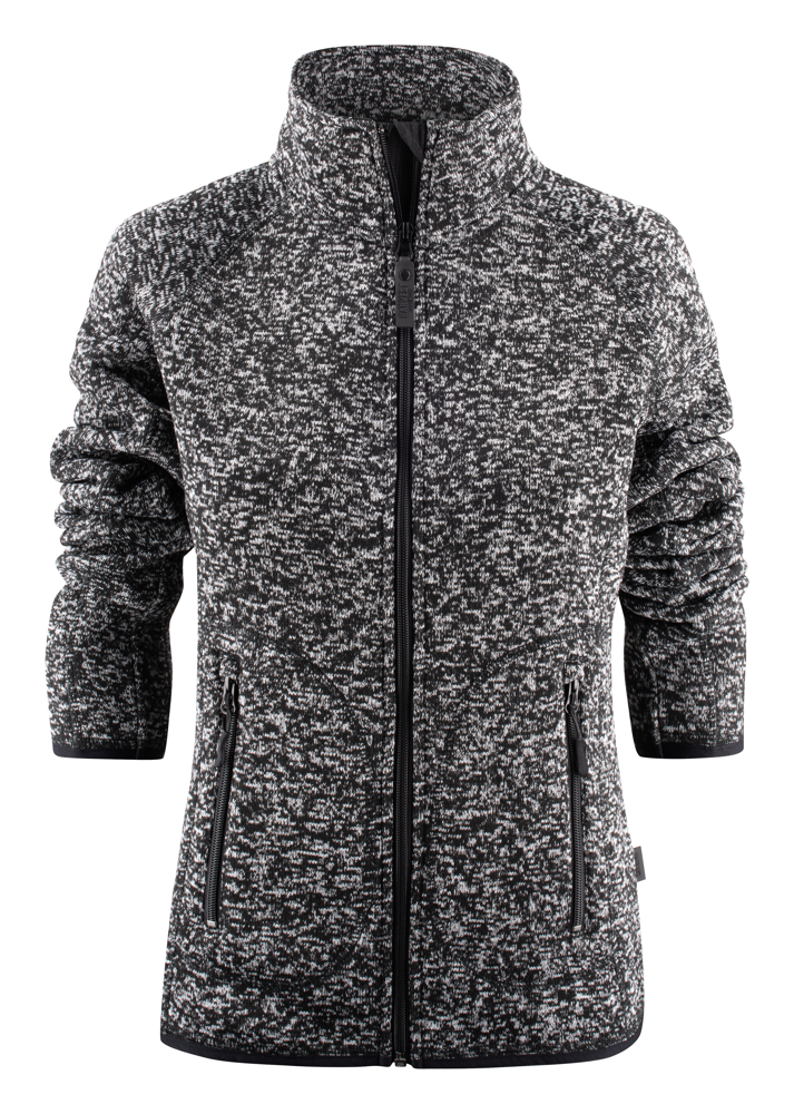 Zwaar gebreide fleecejas met mêlée effect. De binnenzijde is geborsteld. Contrasterende ritssluitingen en flatlock naden. Voorzakken met ritssluiting en elastische zoom aan de manchetten en onderaan de zoom.