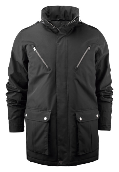 Licht gewatteerde jas met verborgen capuchon in de kraag. Twee diepe voorzakken en twee schuine borstzakken met metalen ritssluitingen.