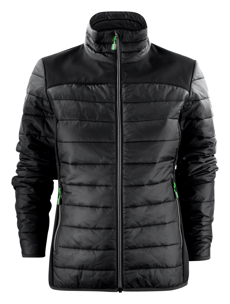 Lichte jas in twee materialen: juk en zijpanelen in softshell en body (voor-en achterzijde) en mouwen in lichtgewatteerd taffeta materiaal. Contrasterende ritssluiting. De zippullers kunnen indien gewenst vervangen worden door één van de andere beschikbare kleuren.