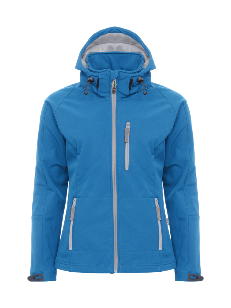 Softshell jas met contrasterende microfleece aan de binnenzijde. Wind- en waterbestendig (WP3000/MVP2000), afritsbare capuchon en manchetten verstelbaar met velcro. Elastisch trekkoord met stopper aan de capuchon en onderaan de zoom. Eén borstzak, twee zijzakken en één binnenzak.