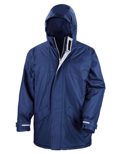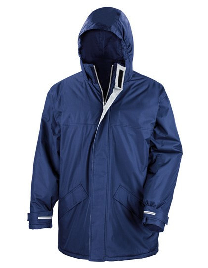 Buitenzijde: 100% Storm-Dri PU gecoate Polyester Pongee / Binnenzijde: 100% Polyester / Vulling: 160 g/m² Polyester | Waterdicht tot 2000 mm, winddicht, super warm en sneldrogend | Verborgen capuchon met 3 panelen in de kraag met versteller | Volledige ritssluiting vooraan | Elastische manchetten | Coördinerende grijze kleur voering | Lange pasvorm | 2 verborgen voorzakken met under storm flappen met super warme fleece voering | Fleece-afwerking aan de binnenkant van de kraag | Verstelbare schokkoorden in onderste zoom | Volledig getapete waterdichte naden | Borduursel: Volledige zoom en linkerborst