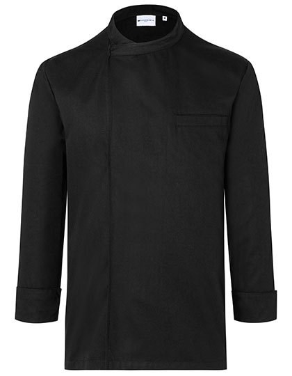Voorzijde: Kledingmateriaal: 65% polyester / 35% katoen, 200 g/m² | Achterzijde: jersey, 100% polyester, ademend, vochtregulerend | Stijlvolle, pull-on-koksjas met lange mouwen | Inzetstuk op de achterkant van jersey (gatstructuur) zorgt voor maximaal comfort en ventilatie | Recht model | Verborgen knoppenpaneel met drukknopen | Het shirt kan worden verbreed met behulp van de drukknopen, zodat het makkelijker snel kan worden aangetrokken | Rechte manchetten met verhoogde ventilatieopening | Steekzak aan de linkerkant van de borst | Steekzak op linkermouw