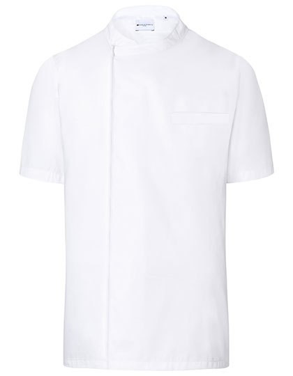 Voorzijde: Kledingmateriaal: 65% polyester / 35% katoen, 200 g/m² | Achterzijde: jersey, 100% polyester, ademend, vochtregulerend | Stijlvolle, pull-on-koksjas met korte mouwen | Inzetstuk op de achterkant van jersey (gatstructuur) zorgt voor maximale flexibiliteit en comfortabele ventilatie | Recht model | Verborgen knoppenpaneel met drukknopen | Het shirt kan worden verbreed met behulp van de drukknopen, zodat het makkelijker snel kan worden aangetrokken | Steekzak aan de linkerkant van de borst | Steekzak op linkermouw