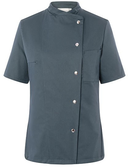 Keperbinding, 215 g/m² | Zeer verfijnd, voorgekrompen, kleurvast, onderhoudsvriendelijk | Boss jas voor dames in een strakke pasvorm | Buste pijltjes, flanknaden aan de voor- en achterkant | Korte mouwen | Opgevouwen, schuine borstzak aan de linkerkant, met pennenzak | Jas met 5 knopen en drukknopen | Geschikt voor industrieel wassen | Wasbaar tot 95 °C