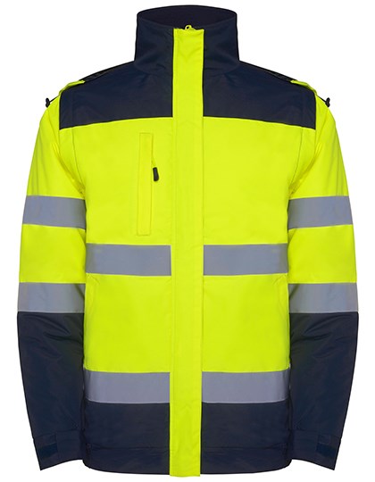 Buiten: 100% polyester — waterdicht, binnen: 100% polyester, voering: 100% polyester, 400 g/m² | Reflecterende stroken op de body en mouwen | Kap beschikbaar met optionele fluorescerende zoom, verstelbaar met stoppers | Borstzak met rits | Twee licht schuine hoekzakken aan de voorkant | Elastische tailleband | Elastische manchetten met verstelbare klittenbandsluiting | Reflecterende rits over de gehele lengte met fluorescerende trekker, flap en klittenbandsluiting | Borstzak met rits aan de binnenkant als afwerking | Verwijderbare mouwen | Wind- en regenbestendig | Gecertificeerd volgens CE-normen: EN ISO 13688:2013 en EN ISO 20471:2013/A1:2016, klasse II | De fabrikant garandeert de reflecterende eigenschappen volgens de EN-norm voor 25 wasbeurten op 30°C | Dit is een artikel over persoonlijke beschermingsmiddelen (PBM's). In overeenstemming met EU-verordening 2016/425 over persoonlijke beschermingsmiddelen is een EU-conformiteitsverklaring van de fabrikant verplicht. Deze verstrekken wij u graag op verzoek.