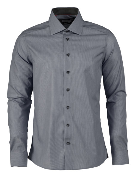 Witte dunne strepen op een blauwe of grijze antraciete basis, maakt het een stijlvolle nieuwe versie van het klassieke gestreepte overhemd. Het hemd kan perfect passen bij alle kleuren en patronen, en is een uitstekende keuze als u een aantal kleuren aan uw standaard wit & blauw garderobe toevoegt. Het hemd is gemaakt in onze favorite twill stof voor perfecte resultaat. Ook voegden wij moderne contrast details toe samen met standaard kenmerken zoals een half afgesneden kraag, een vlakke voorkant, een hoekmanchet en een gespleten juk op de rug. Het hemd is goed ontworpen om u in éen dag van kantoor naar het diner te brengen.