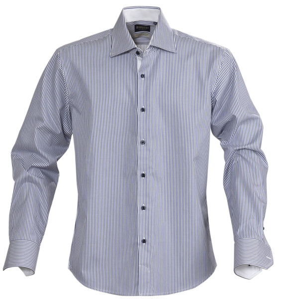 Herenhemd van hoge kwaliteit in gekamd katoen. Streepjespatroon met contrastkleur onder de kraag, aan de knopenband, manchetten en neklint. Voorzien van extra versteviging aan de naden, kraag en manchetten. De stof is nabehandeld met easy care voor makkelijk wassen en strijken. Oeko-Tex 100 gecertificeerd.