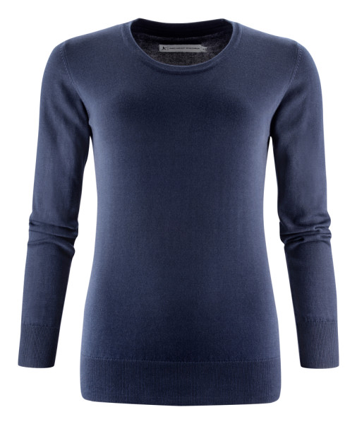 Gebreide sweater met ronde hals. 1x1 rib aan de halsuitsnijding, aan de zoom en aan de manchetten. Dubbelgevouwen, zachte rand aan de kraag.