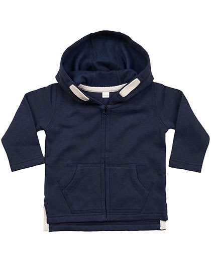 Biologische of in omschakeling naar biologische katoen / gerecycled polyester (rPET) | Zachte, binnen ruwe capuchonjas met rits voor baby's | Diepe 3-delige capuchon uit één laag voor een betere pasvorm | Flatlock-naden | Natuurlijke nekband met visgraatrug | Binnen locker patch voor decoratie | Kangoeroezakje | Rechte zoom met zijsplitten en staart terug | Natuurlijk visgraatband detail aan de zijkant van de capuchon / met trekkoord | Afscheurbaar neklabel