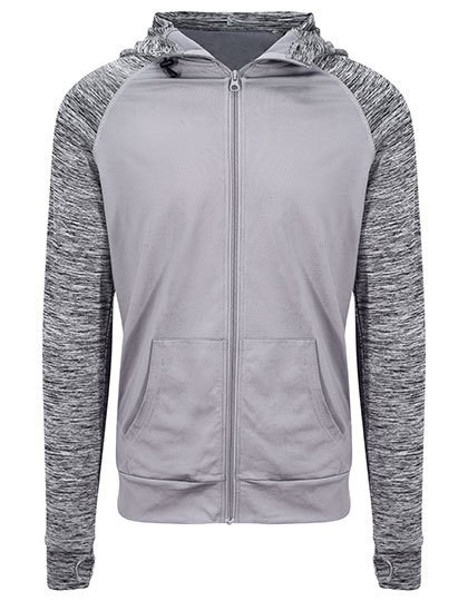 Slim fit | AWDis' eigen gemengde stof met elasthaan dat zorgt voor stretch, comfort en een goede pasvorm. | Vochtafvoerende, sneldrogende stof | Volledige rits aan de voorkant | Contrasterende gemêleerde mouwen | Kangoeroezakje | Afgeronde zoom aan de achterzijde | Verstelbare kap | Opening voor duimgat | Raglanmouwen | Afscheurbaar etiket