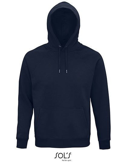 Fleece 280 | 80% biologisch katoen / 20% gerecycleerd polyester | 3 draden | Binnenzijde opgeruwd | Buitenkant: 100% katoen, ribben: 97% biologisch katoen / 3% elastaan | Biohoodie | Zijnaad | Gekruiste hals | Kangoeroezakje | Raglanmouwen | Halve-maanvorm in hals | Katoenen nektape | 2x2 geribde manchetten en zoom | Zilveren oogjes en stoppers | Rond ton-sur-ton trekkoord | Geen etiket