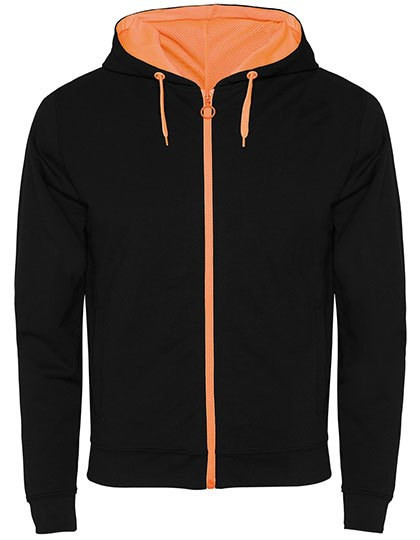 Slubgaren | Uniseks sweatjack met fluorescerende delen | Volledige ritssluiting met fluorescerende trekker | Capuchon binnenkant van mesh stof, trekkoord en metalen ogen in fluorescerende kleur | 1x1 rib gebreide manchetten en zoom | Twee voorzakken | Versterkte tape in de nek | Afscheurbaar etiket | Niet geborstelde aan de binnenzijde