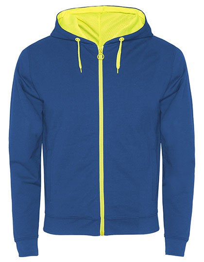 Slubgaren | Uniseks sweatjack met fluorescerende delen | Volledige ritssluiting met fluorescerende trekker | Capuchon binnenkant van mesh stof, trekkoord en metalen ogen in fluorescerende kleur | 1x1 rib gebreide manchetten en zoom | Twee voorzakken | Versterkte tape in de nek | Afscheurbaar etiket | Niet geborstelde aan de binnenzijde
