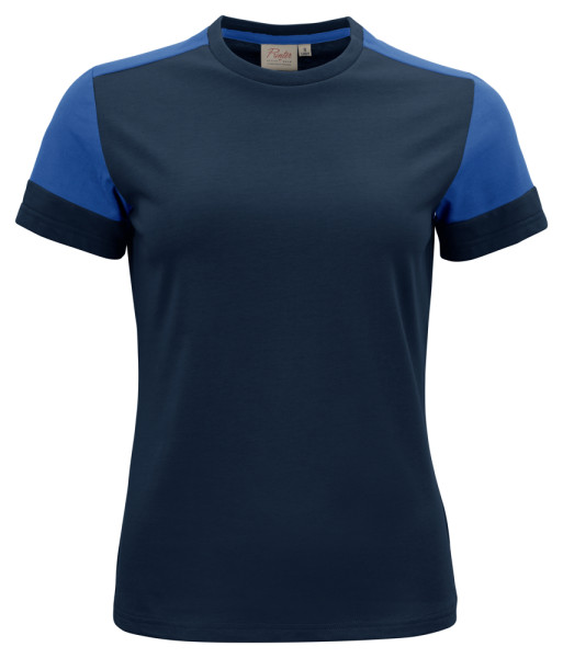 Moderne, aansluitende bicolor T-shirt met geribde nek in vier lagen en elastaan in de boord. Uitscheurbaar neklabel en afzonderlijk geweven maatlabel. Aan de binnenzijde van de linkerzijnaad werd een zakje voorzien voor het innaaien van een waschip. De stof is ringgesponnen en nabehandeld met een enzyme wash, waardoor het materiaal voorgekrompen is en zacht aanvoelt. Oeko-Tex 100 gecertificeerd.